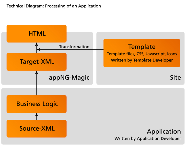 An appNG application relies on three core concepts: XML, Java and templating. The basic idea is that you define the structure of your user interface in XML and implement the business logic in Java. Finally, the templating engine transforms the internal XML-based structure into an HTML-based user interface.